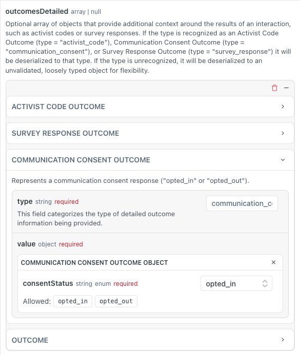outcomesDetailedarray now supports a new "Communication Consent Outcome" object specifically for opt-in/out functionality. More info in the Body Params section here.