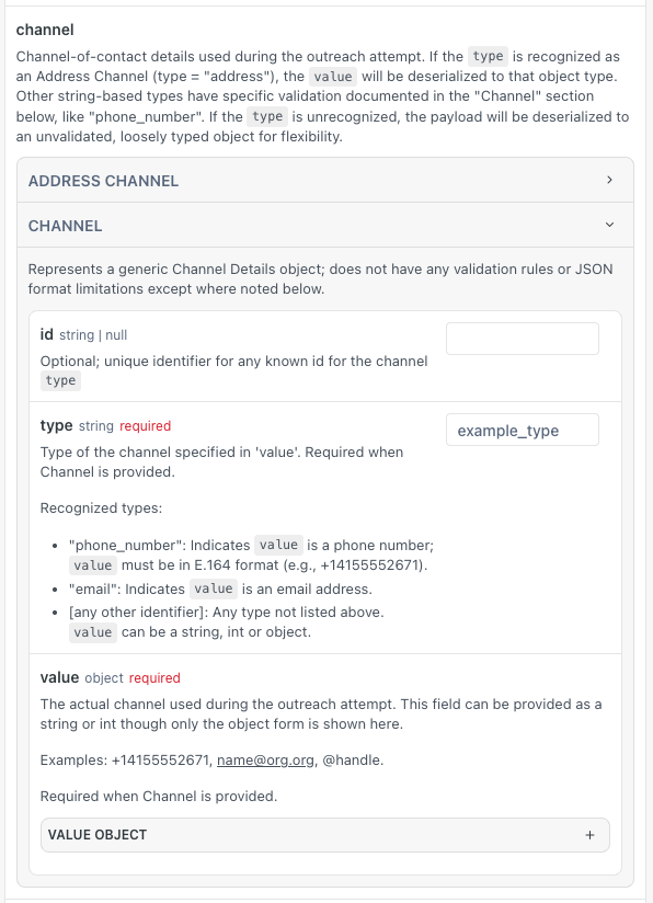 Phone numbers are now subjected to validation when provided and properly identified via the "phone_number" channel.type as described above. Phone number formatting must follow the E.164 standard or the request will be rejected.