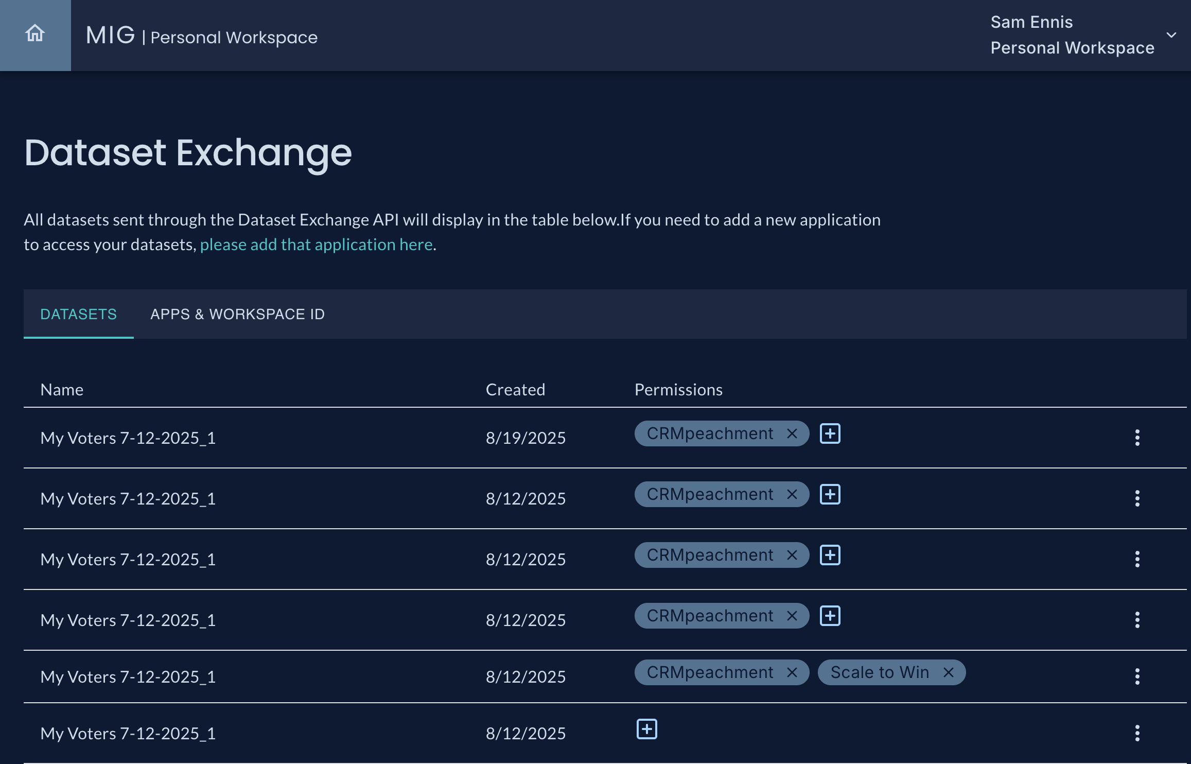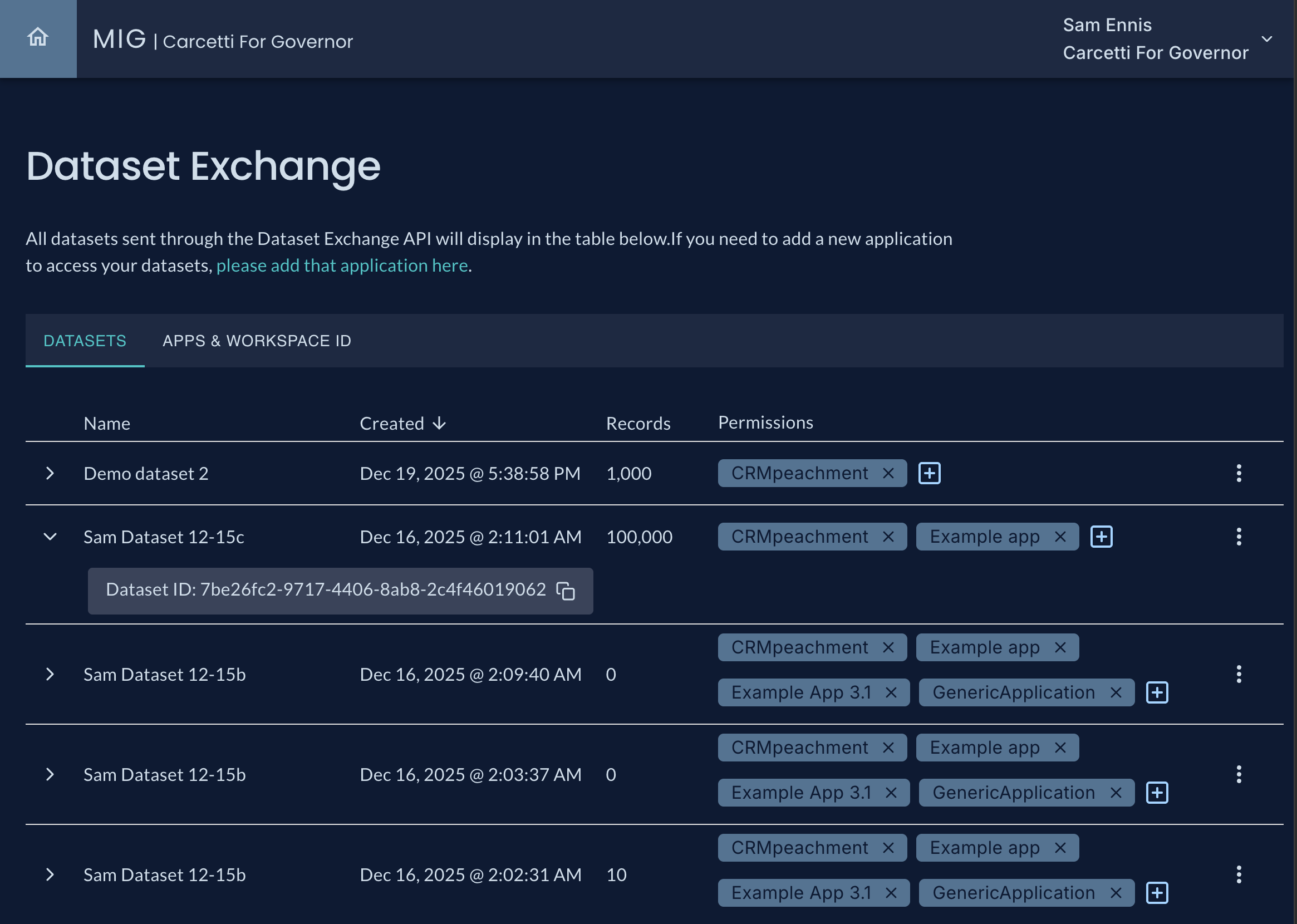 - Dataset rows are now expandable. Expanding them shows the Dataset ID, which you will use when interacting with that dataset via the Dataset Exchange API