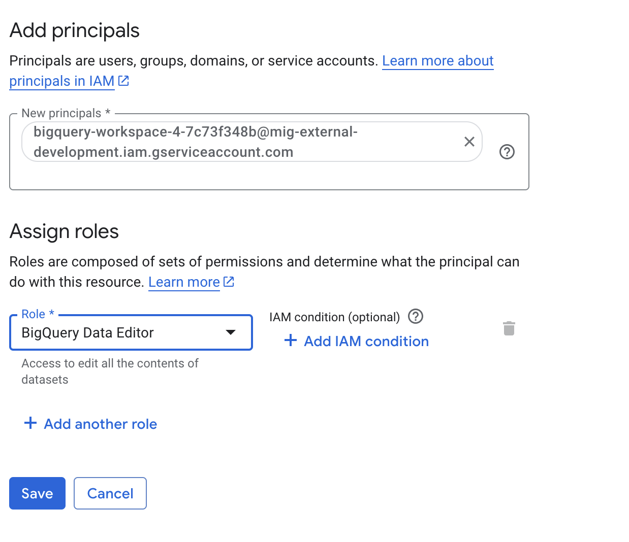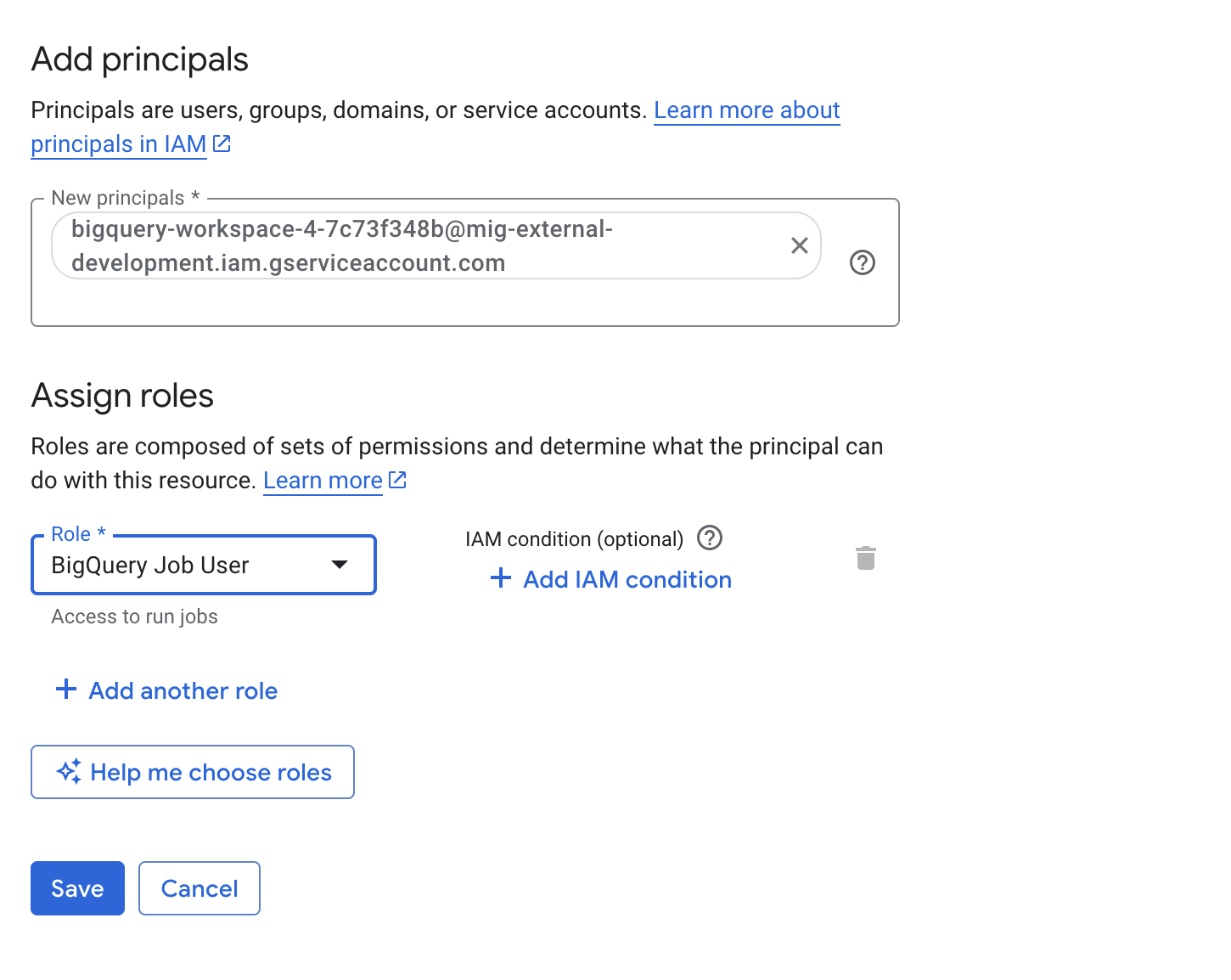 - Confirm the generated service account has been given the BigQuery Job User and BigQuery Data Editor roles and that they have been saved. It can sometimes take a couple minutes to propagate.