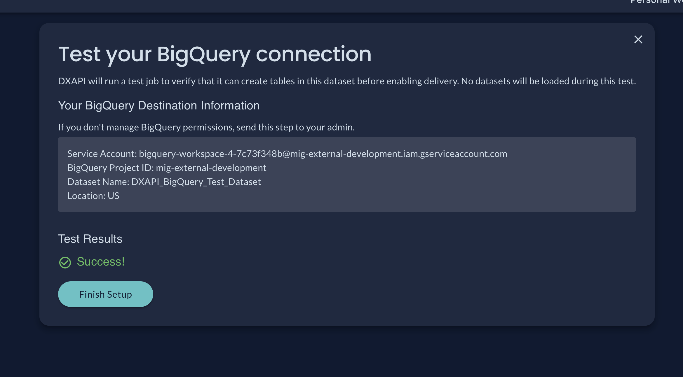 - DXAPI will run a test job to verify that it has the correct permissions to create tables on the Dataset before enabling delivery. No records will be loaded during the test.