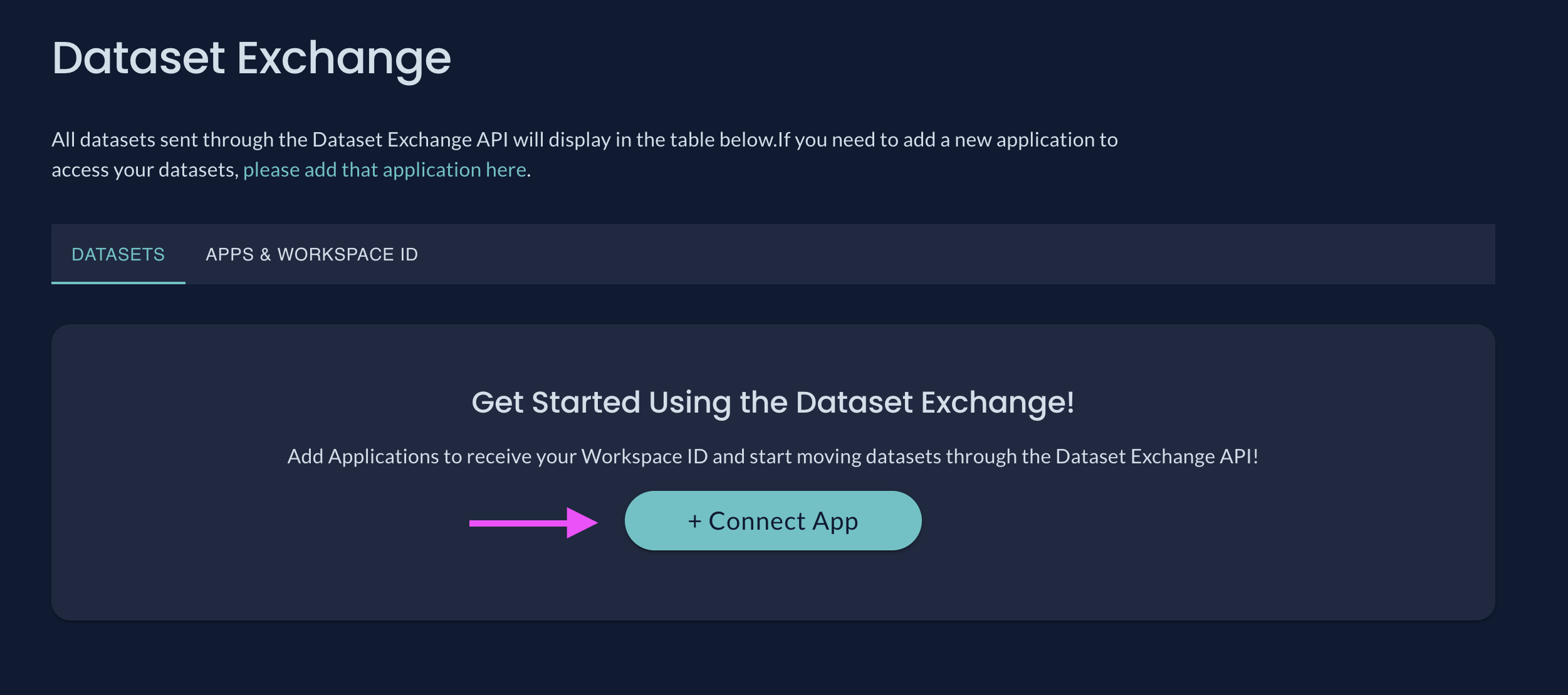 - Select "Connect App" to see available Applications using the Dataset Exchange API: