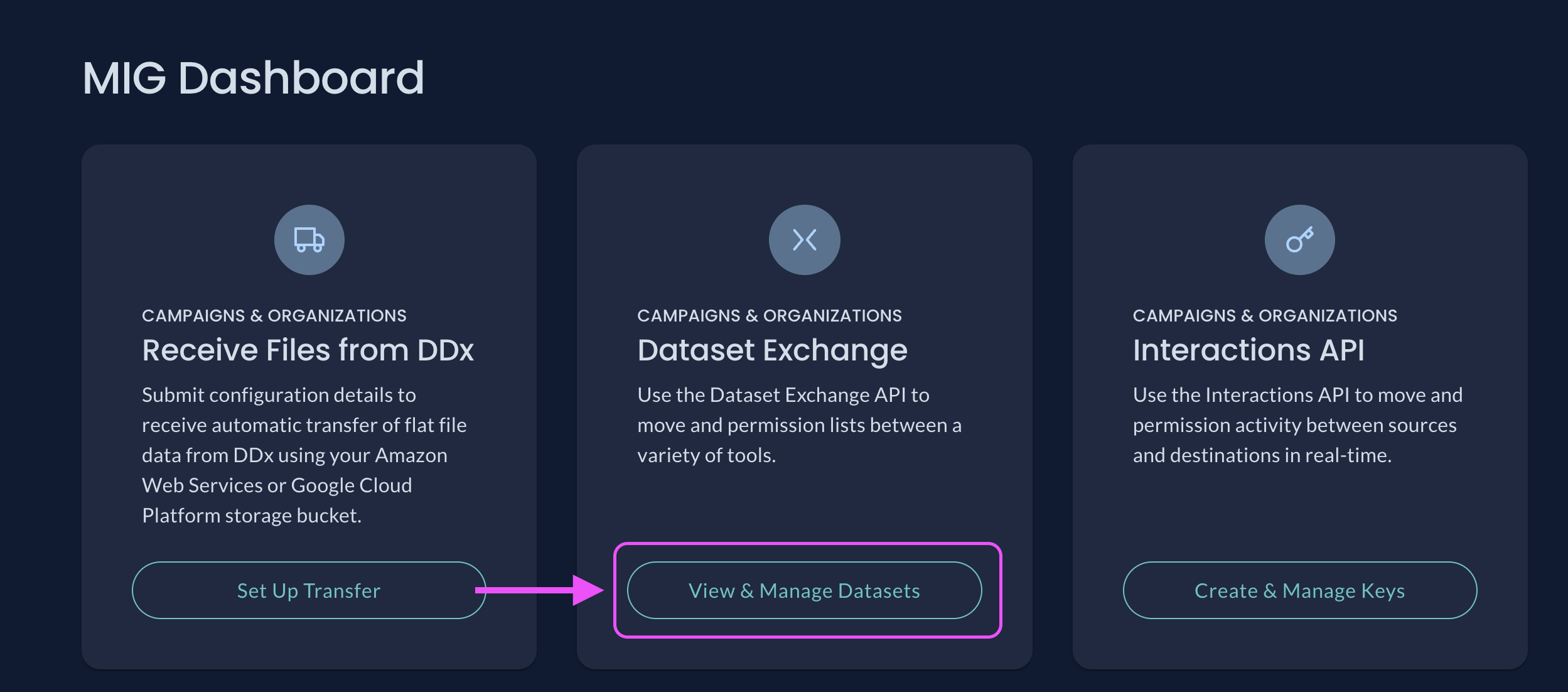Select "View & Manage Datasets" in your Workspace Dashboard:
